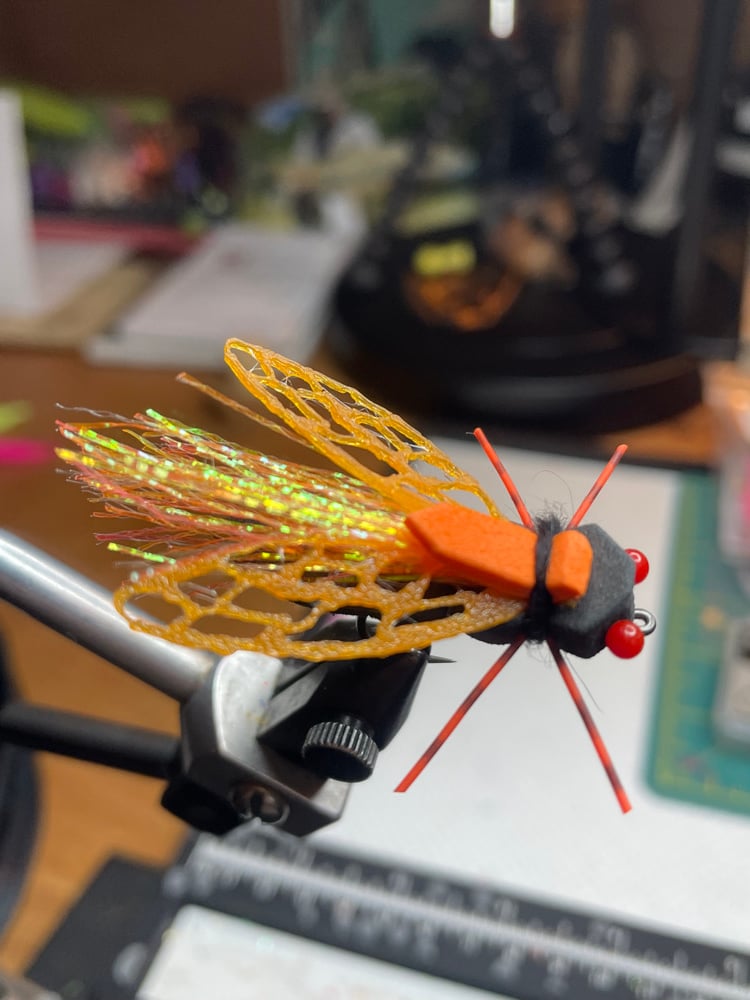 Another massive Brood Cicada hatch is coming to the Midwest/Southeast at the end of May 2025 and should last through June 2025, they are saying up to one million cicadas per acre in some areas!! Carp and Bass go absolutely bonkers over Cicadas, especially during massive Brood hatches !! This version of my Cicada pattern has cutout wings that make this fly Super realistic! This fly is a great top water Cicada imitation for Carp and Bass, Grass Carp love it too and eat this fly from Spring to Fall, even when cicadas are not dropping! Tied on a #4 wide gap hook. This fly has caught hundreds of carp and bass. The orange color is a brood color and the chartreuse is the annual dog days Cicada color.