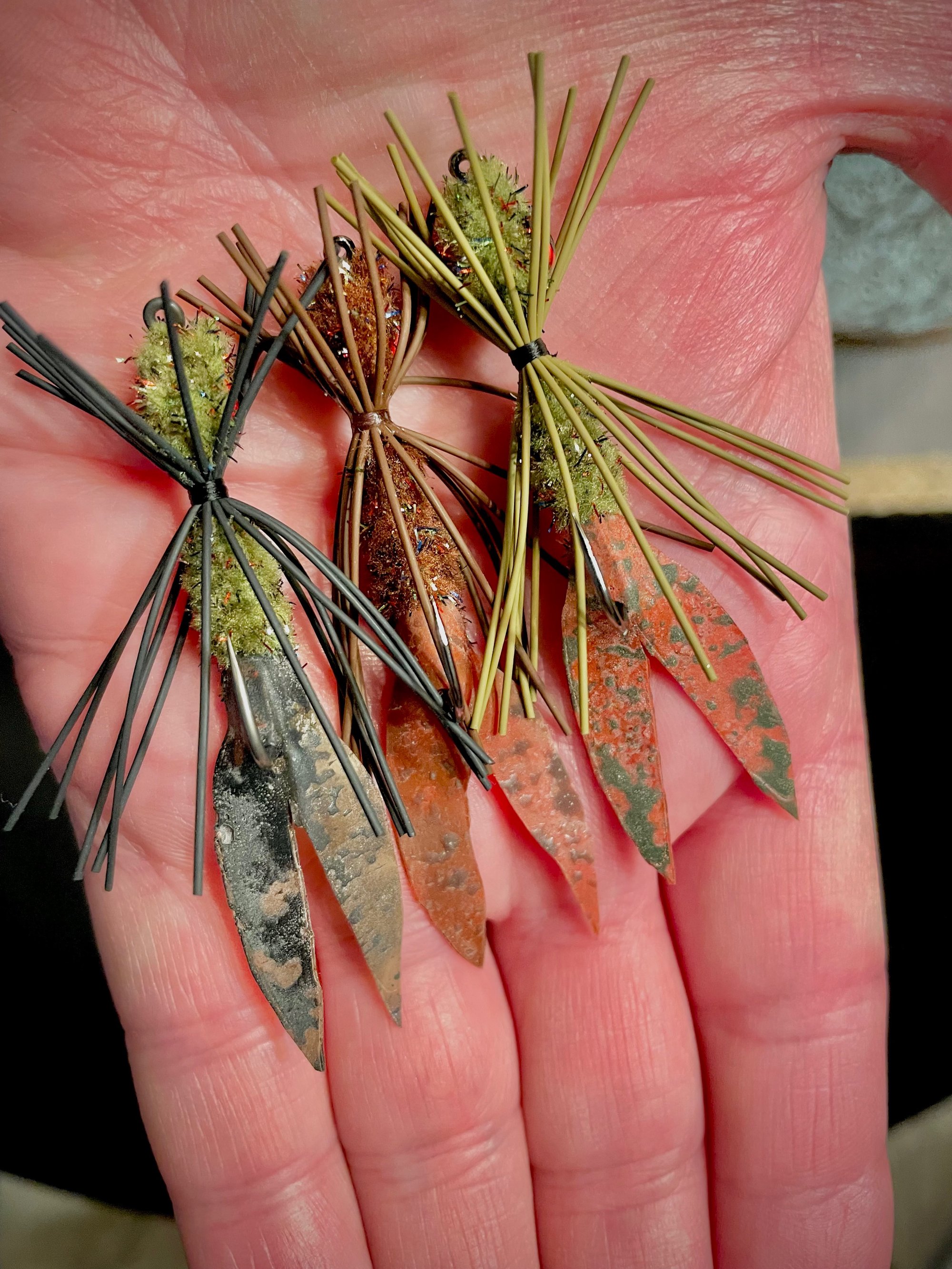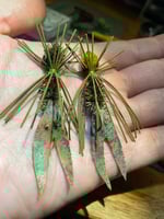 This is probably my favorite fly when I really need to land a Smallmouth, and is my version of the Kraft's Clawdad. This fly has produced amazing results for me and my clients. It's the Fly Fishing version of the Pig & Jig used by the conventional guys. Many times, this fly will be my go to fly for Smallmouth, Largemouth, drum, even carp on my guide trips. A very good fly for Carp, drum and Smallies on the Great Lakes as well, plus Bull Redfish and Black Drum in the Louisiana marsh have eaten this fly too! It is an outstanding fly early in Spring and especially in the Fall and Winter, any fish that eats Crustaceans will eat this fly with aggression, including saltwater fish. The claws are made from Kiley's Exo Skin a thin rubber type material and is literally indestructible, and comes in some great solid and mottled colors. The claws are 1.75" long, and the fly comes with medium dumbbell eyes, and are tied on extremely sharp Gamakatsu S11 streamer hooks and Heritage streamer 5x hooks. One of my favorite colors is the frog skin color claw, it is mottled olive and brown on the top claw and yellow on the underside of the claw and the fish really see this color well! You won't be disappointed with the results trust me!