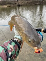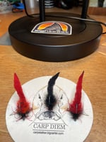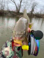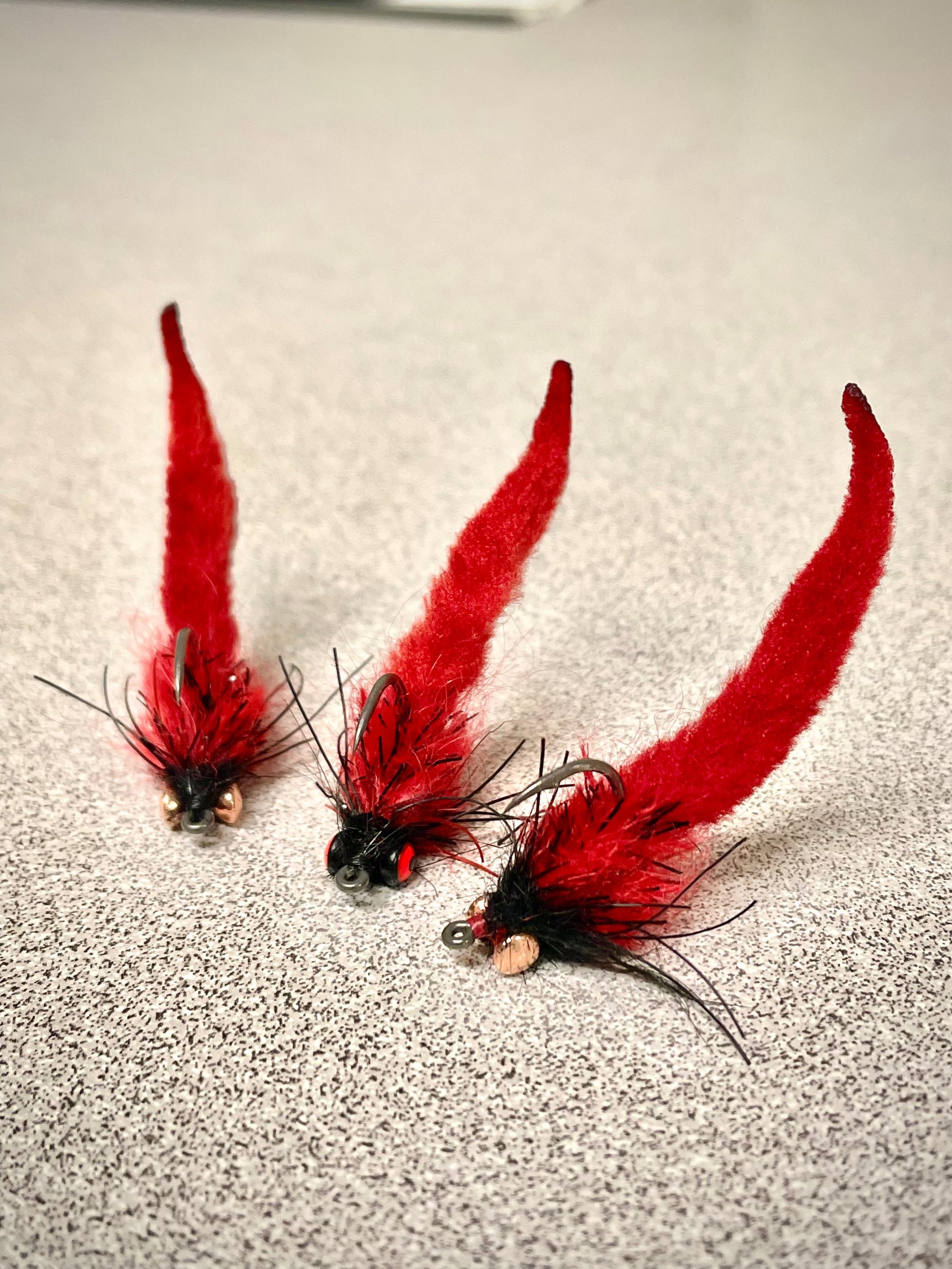 Same fly as the Pollywog but without the foam on the tail. The tail still stays fairly upright off the bottom without the foam, since it's tied on a curved shank hook. The body material is very buggy with thin black strips of flash. I really like this fly, especially the Red and the Pink color along with the low profile #10 hook. Tied with XS lead dumbbell eyes, however Wide-eyed bead chain eyes can be substituted, just leave a note upon checkout. Grass Carp love the Black too !