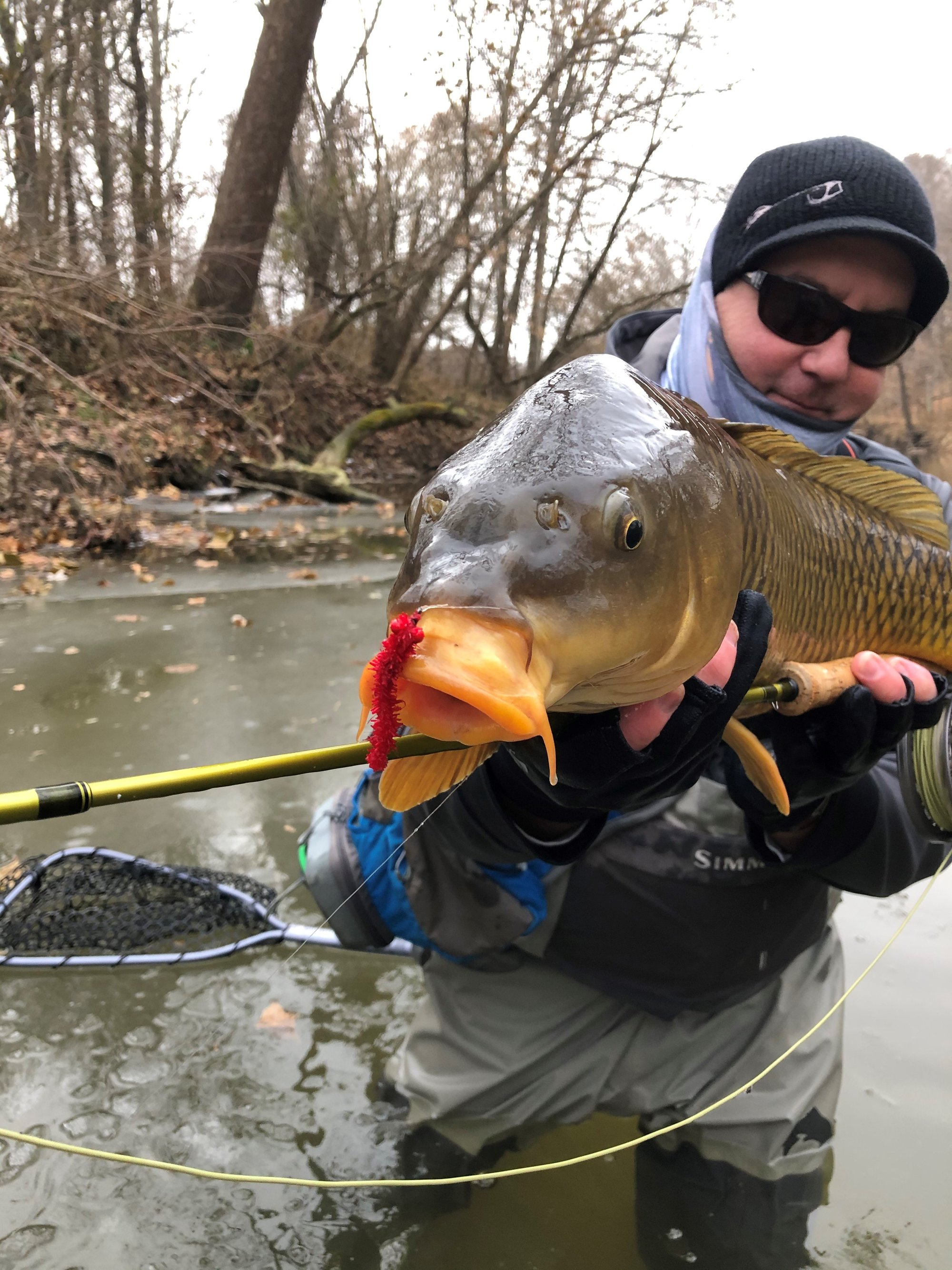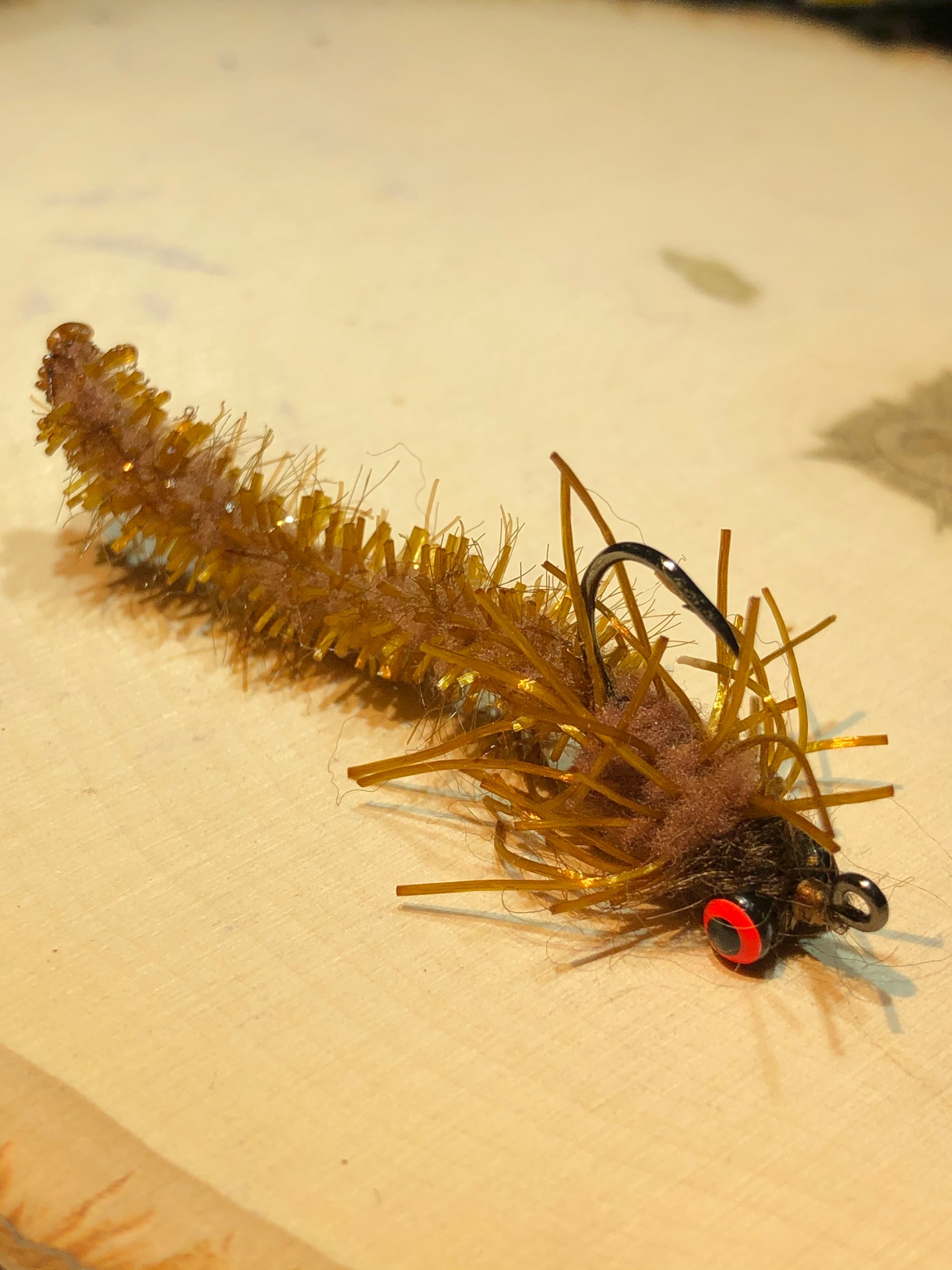 Same as the Ice Breaker fly, except the body has longer rubber Legs along the body of the fly, giving it a buggier look. Deadly on many species, but made for Carp. Tied on an Ahrex 60 degree mini jig hook with XS double pupil dumbbell eyes, the fly is roughly 1 3/4 to 2 inches long. This fly descends perfectly down to the feeders, not too fast and not too slow. Bead Chain eyes can be substituted if you want a lighter presentation for real shallow fish, just leave a note upon checking out. Big Carp eat this fly up as do Smallmouth Bass !