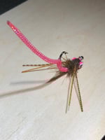 Same as Corya's Carpin' bug, but the braided tail is flashier and has a dual color depth to it, and it's slightly heavier than Corya's Carpin' bug due to the braided tail material. A great choice for mudding Carp, and for off color or stained water, as well as deeper water. The carp will see the sparkling tail very well and the rubber legs give this fly enticing movement. Tied on a #8 wide gap curved shank hook, with x-small dumbbell eyes, so the fly stands upright on the bottom for a realistic presentation, this fly gets down pretty quickly too. A perfect fly to do the drag and drop method. Medium Bead chain eyes or x-small brass eyes can be substituted upon request for less weight, just leave me a note upon checkout. Bass and Bluegill eat this fly too!